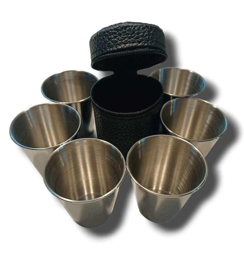 Rosterinen Snapsisetti, sisältää 6kpl 70ml rosteri laseja näppärässä keinonahkaisessa kotelossa. Lasien kylkeen haluamasi kaiverrus, koko n. 40mm x 40mm.